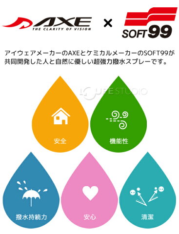 4930097103017 ls@AXE-G-N3超強力撥水スプレー ウォータープルーフプレミアム ガス不使用 石油系溶剤フリーの撥水剤 AXE アックス ソフト99 撥水 防水 スプレー アウトドアウェア レインウェア 傘雨具 AX-31アイプロテクションメーカーのアックスとケミカルメーカーのソフト99とのコラボレーションで生まれた健康に影響がなく、環境に優しい新時代の繊維用撥水スプレー。